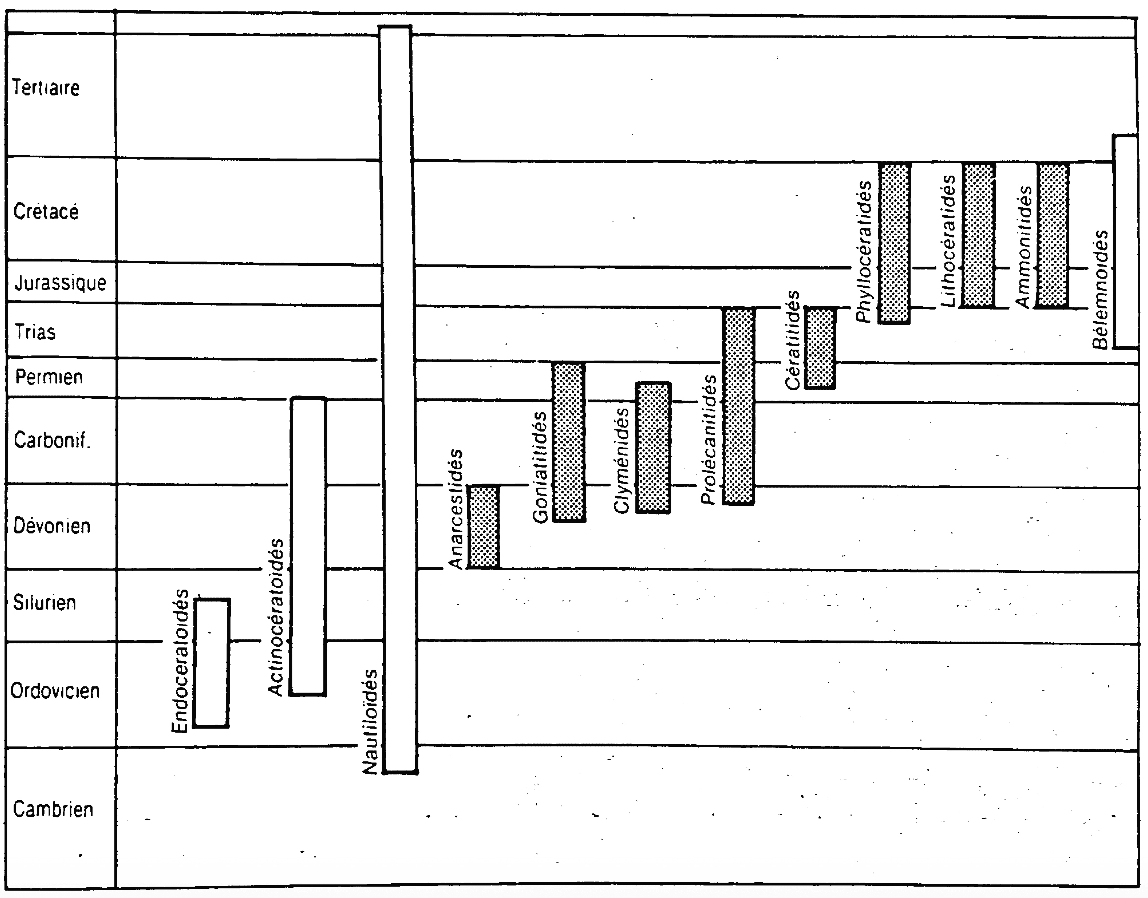 Répartition stratigraphique des Céphalopodes (Ammonites en gris)