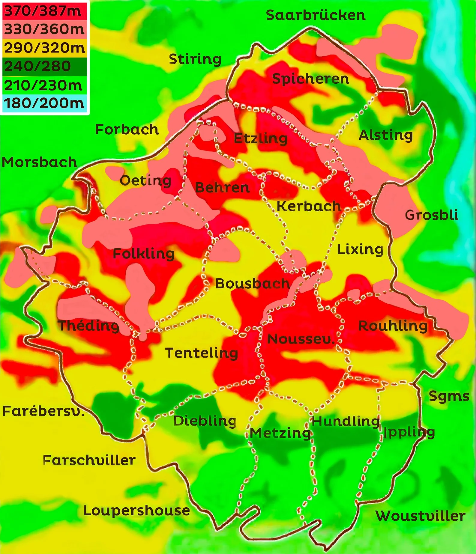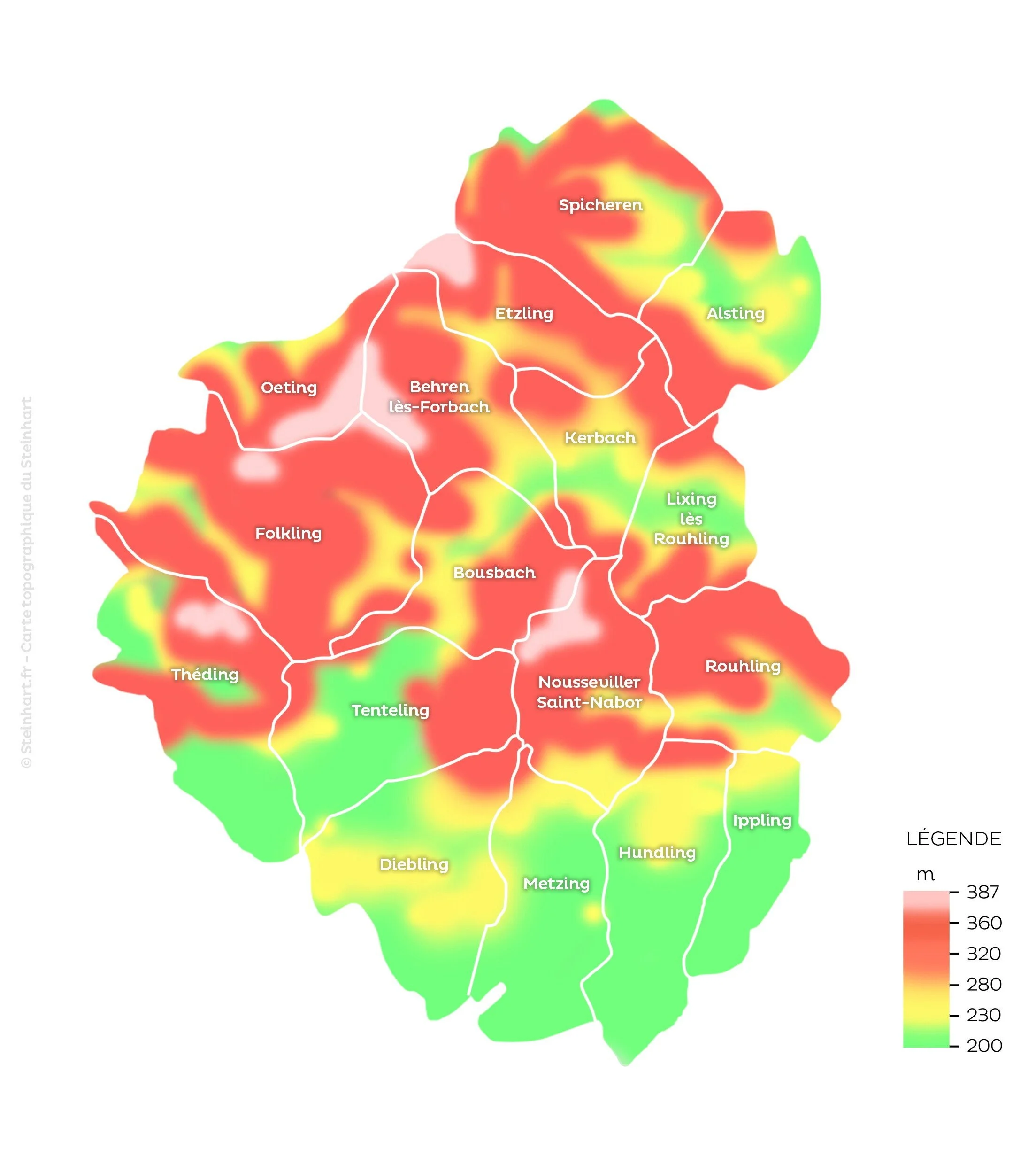 Dominé par des altitudes moyennes, et des zones d'altitude plus élevées (330-387m) se manifestent sous forme de collines, concentrés majoritairement au nord de la carte.