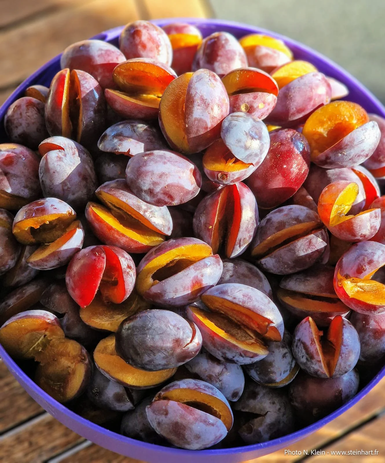 Nos anciens l’ont appréciée sous toutes ses formes : fruit frais au goût légèrement sucré, amer et acidulé, fruit séché pour une conservation longue, confitures, marmelades ou encore le fameux Quetscheschlèggel (marmelade de quetsches) et le traditionnel Quétschekùùche (tarte aux Quetsches). Elle a aussi trouvé sa place en bocaux, au congélateur… Véritable trésor polyvalent, la quetsche a su, au fil des générations, régaler les papilles des Steinhartiens et accompagner leur vie quotidienne… jusqu’à son utilisation au second degré tel que "c'est une quetsche", "elle à mal a la quetsche" etc.