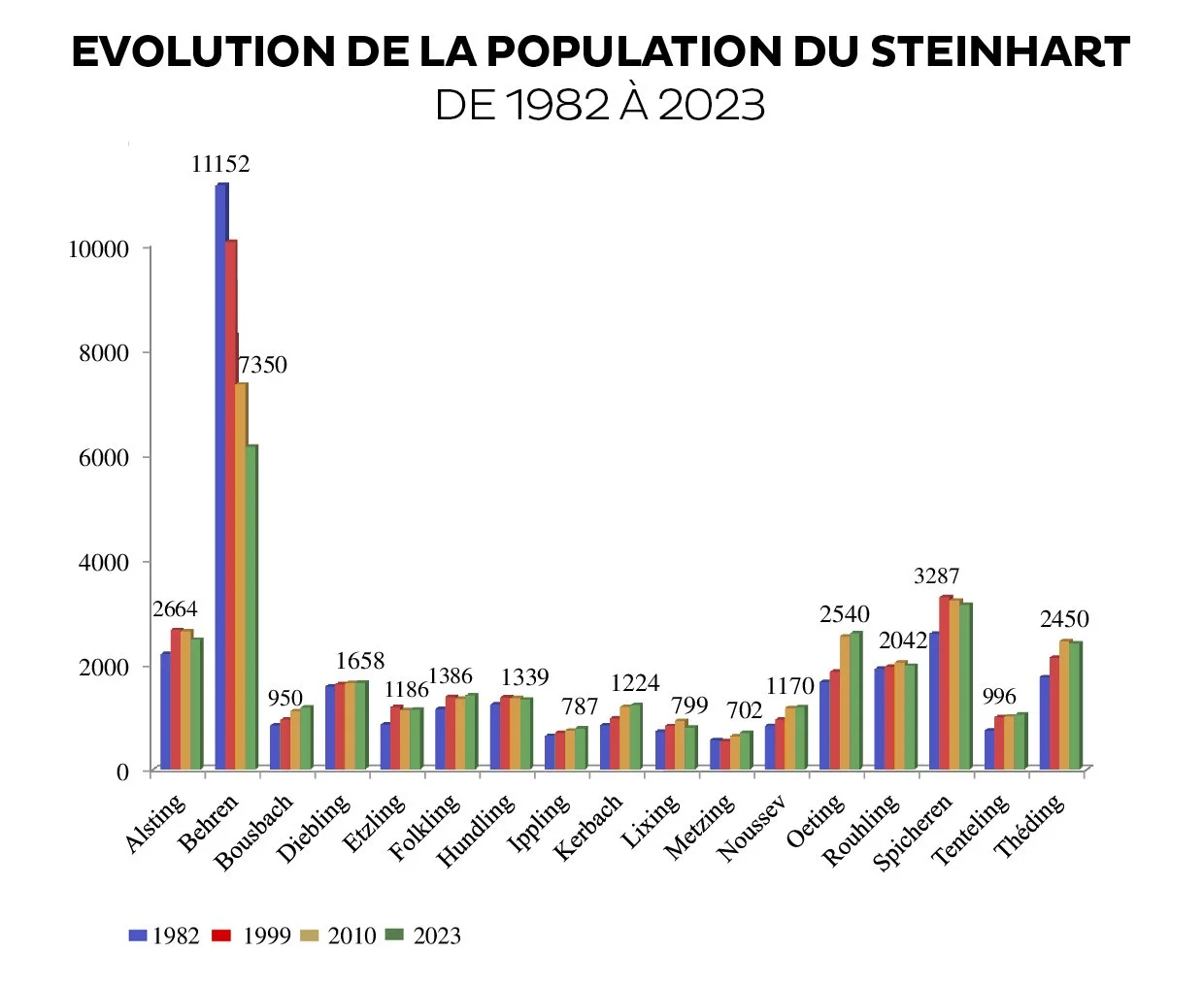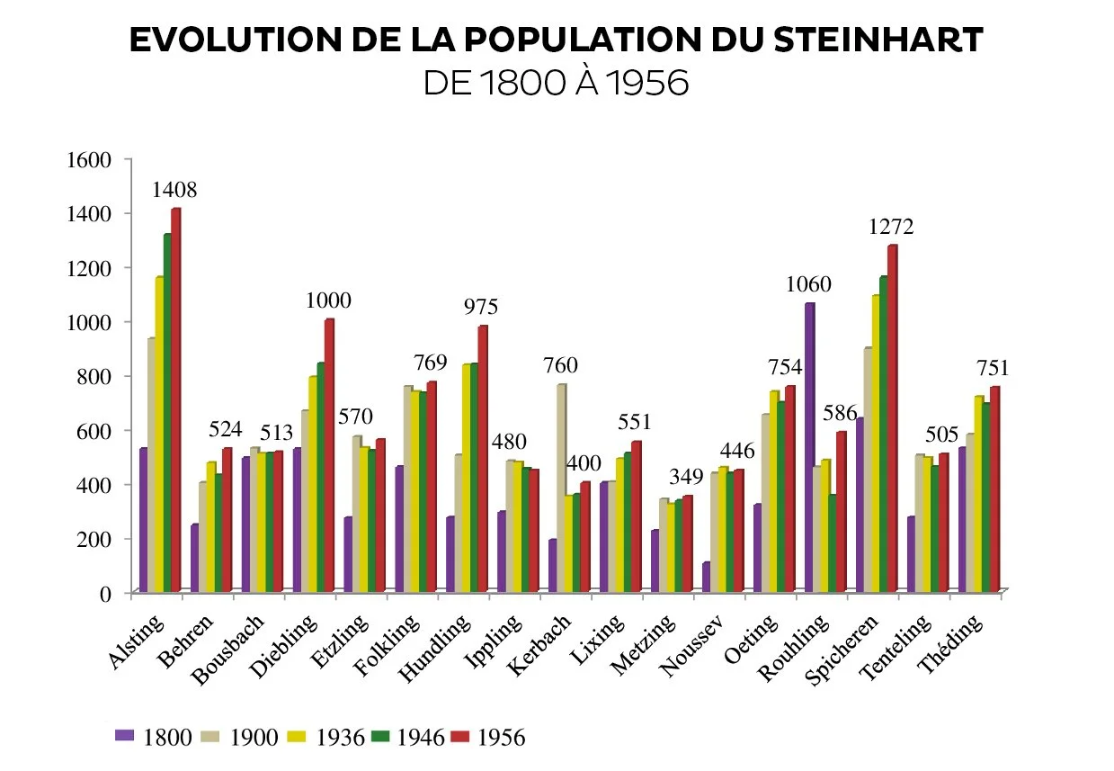 L’étude démographique des communes du Steinhart met en évidence une histoire profondément marquée par les grands bouleversements du territoire mosellan. Entre évolutions lentes au XIXe siècle, ruptures liées aux conflits, urbanisation rapide au XXe siècle et dynamiques transfrontalières plus récentes, la population locale n’a jamais cessé d’évoluer.