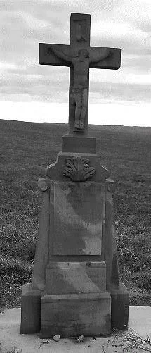 Croix I : Naguère loin du village, route de Grosbliederstroff, aujourd’hui à l’entrée de la « Cité », autrefois à la merci des attelages agricoles et des automobiles, aujourd’hui bien « protégée » derrière une armoirerelais et un poteau du réseau électrique. Cette croix a une longue histoire mouvementée…Elle avait été érigée vers 1755 par Etienne WILLAR et son épouse Ursule MASSING, couple marié en 1742 et parents de huit enfants. Vers 1830, elle était écroulée et fut restaurée par Jean WARY, célibataire, né en 1773, maître‐tailleur et trésorier du Conseil de Fabrique, petit‐fils d’Etienne WILLAR. Elle fut bénie le 16 juillet 1837 par l’abbé Augustin BARTH. Vers 1912, elle fut renversée par une charrette de foin de Pierre SCHMITT, qui l’a fait restaurer en y faisant mettre un Christ en fonte. Ci‐contre la charmante photo de 1938, qui représente le calvaire d’origine.