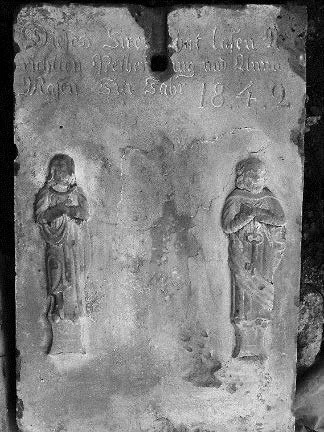 Les inscriptions sont difficilement lisibles, surtout la date dont le 3e chiffre est effacé (1800 ou 1810). Elle est assez étroite et bien dans le style du début du 19e siècle. Elle avait été érigée par le couple Jacques WILLAR (1768‐1838) et sa 2e épouse, Eve WEILAND (1774‐1851) qui s’était mariée en 1802 après que Jacques eut perdu sa 1ère épouse, Marguerite FISTIE en 1800.