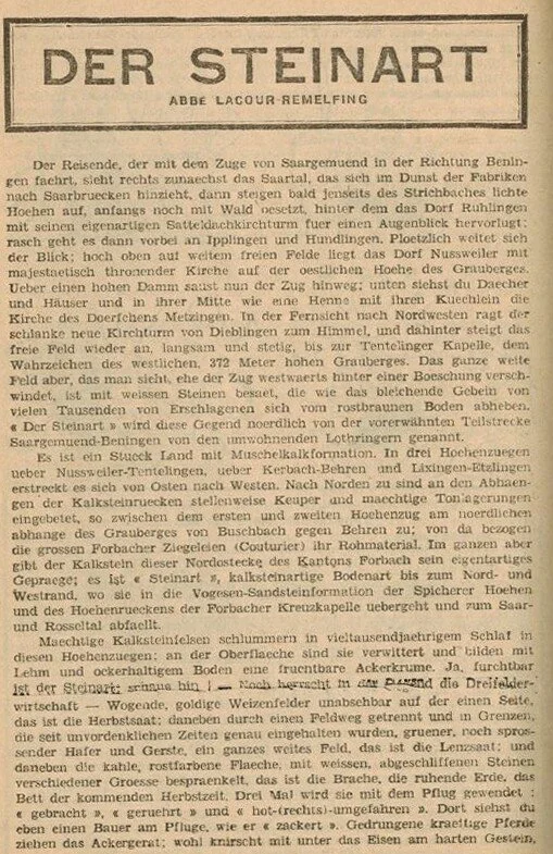 En 1934, l'abbé Lacour de Remelfing a composé une ode en allemand dédiée au Steinhart, un lieu chargé d'histoire et d'émotions. Ce poème, empreint de lyrisme et de passion, témoigne de l'attachement profond de l'abbé à cette terre.