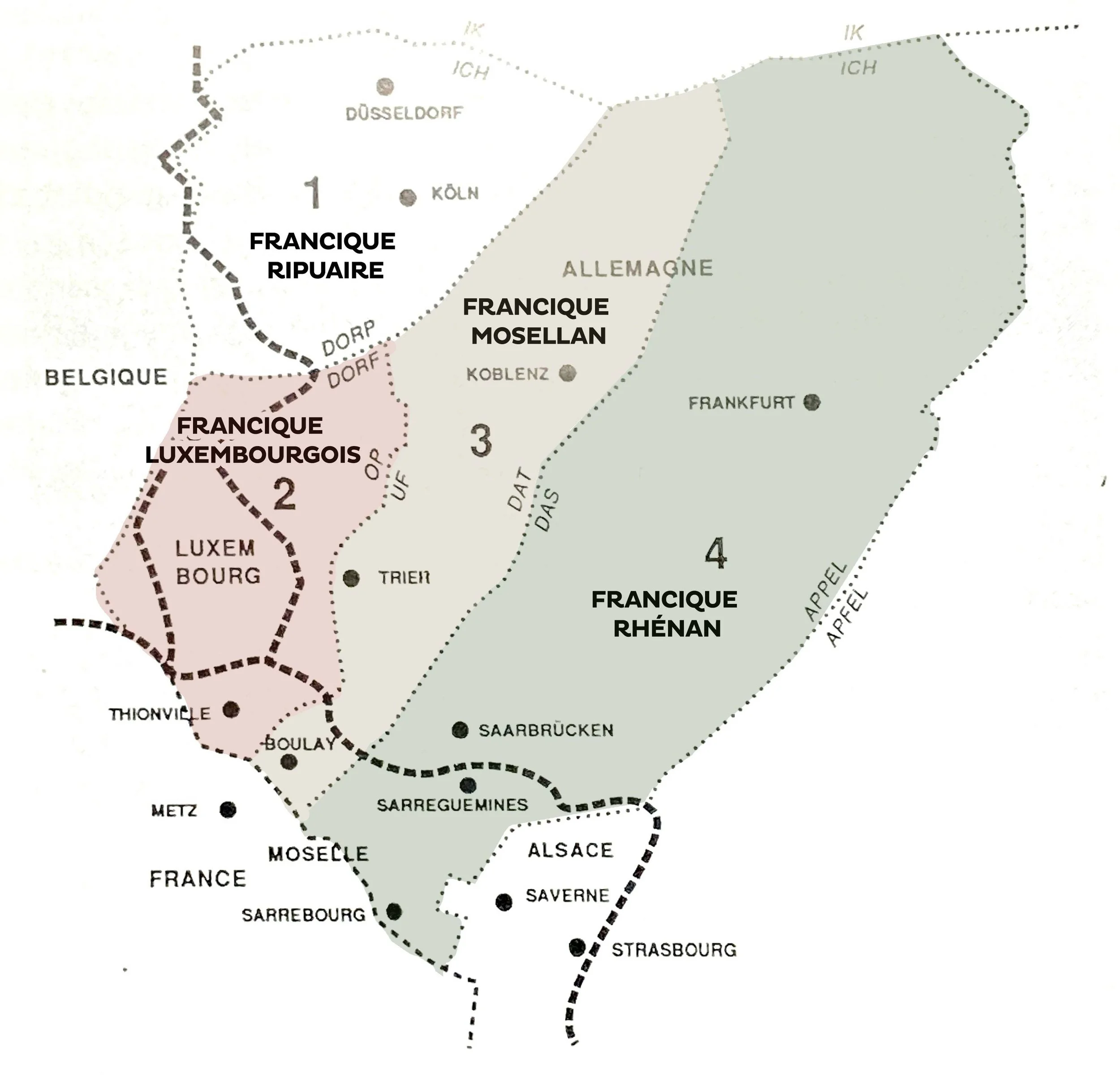 Francique mosellan : parlé dans le Nord Est Mosellan et dans certaines parties du Luxembourg et d’Allemagne.