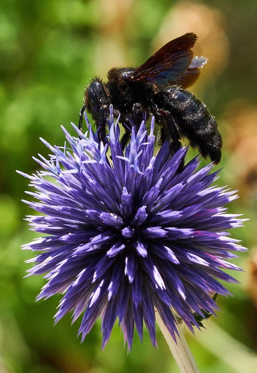 L’abeille charpentière est une impressionnante abeille sauvage, facilement reconnaissable à son grand corps noir bleuté, souvent brillant au soleil, et à son vol rapide et sonore.