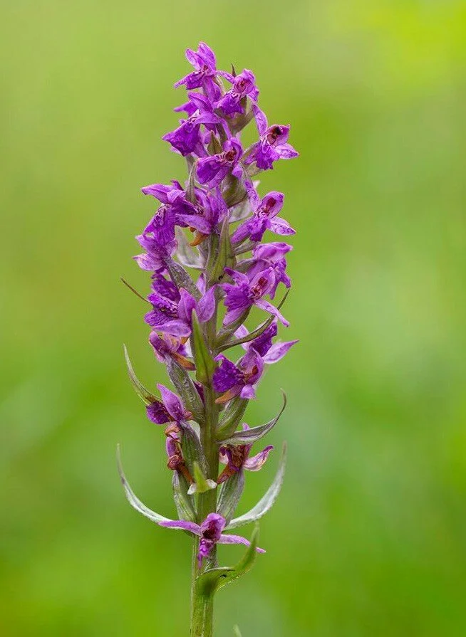 L'orchis incarnat est l'une des orchidées sauvages les plus précoces et les plus discrètes de nos zones humides mosellanes. Géophyte à tubercules palmés (caractéristique du genre Dactylorhiza), elle développe des tiges robustes et creuses de 20 à 60 cm, dressées, portant 4 à 8 feuilles dressées, étroitement lancéolées, d'un vert vif et non tachetées, ce qui la distingue immédiatement de nombreuses dactylorhizes voisines.