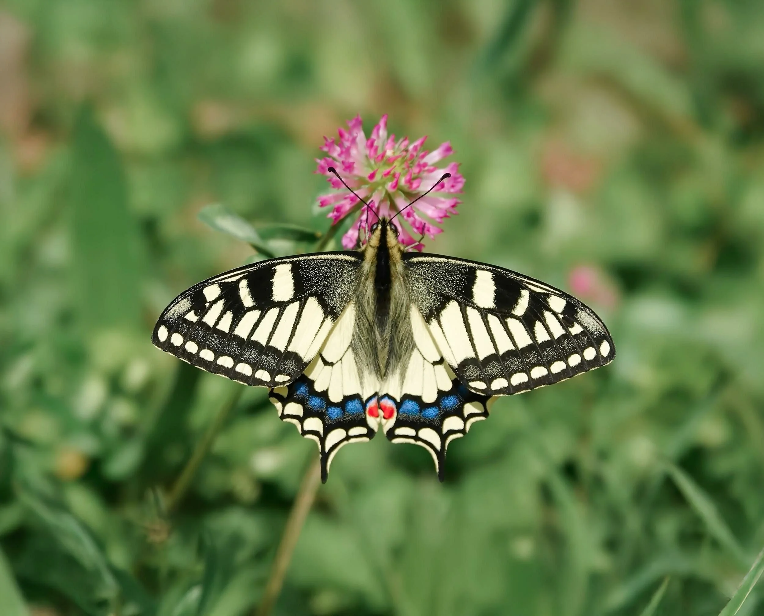 Le Machaon (Papilio machaon) est un grand papillon de la famille des Papilionidae, connu pour ses ailes jaunes ornées de motifs noirs et de petites taches bleues et rouges. Son envergure varie entre 65 et 90 mm.