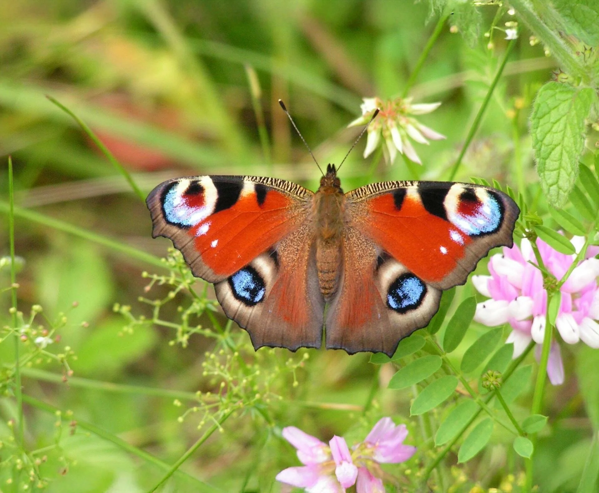 Le Paon de jour (Aglais io) appartient à la famille des Nymphalidae. Il se distingue par ses ailes rouges ornées de quatre ocelles colorés ressemblant à des yeux, qui servent à effrayer les prédateurs. Son envergure est de 50 à 55 mm.